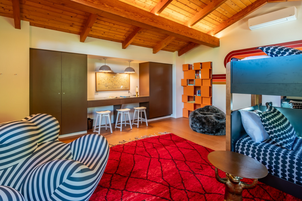 Returning home, you'll love to lounge in the spacious Living Room and Kitchen, both of which fill with natural light due to the large and bright windows, looking out onto the town's majestic mountains. Cathedral ceilings with exposed wood beams give the place a warm cabin-esque vibe, while the gorgeous state of the art Kitchen is as hip and fashionable as they come. Entertain with ease in the elegant dining room or in the delightful yard, which features an outdoor stand-up jacuzzi, a bocce ball court, a pond, and chair swing. Enjoy the pool in any weather without missing out on any views with the large and glass enclosed indoor pool. With four Bedrooms, stunning scenery, and dazzling indoor and outdoor amenities, this haven is the perfect place to revel in the beauty of nature from morning till night.
