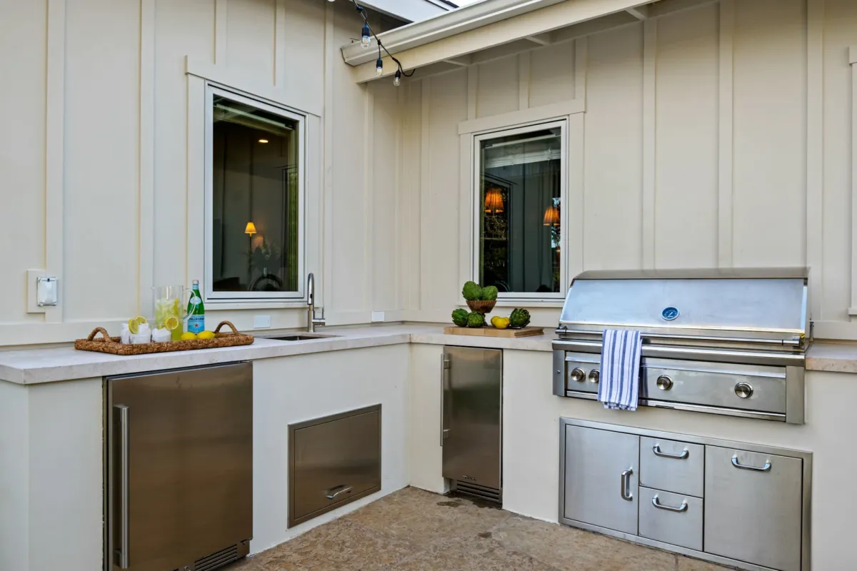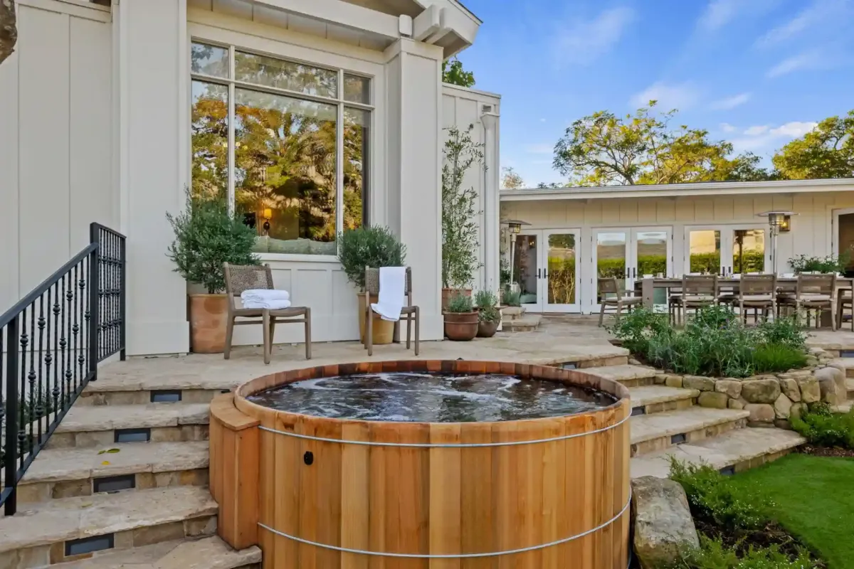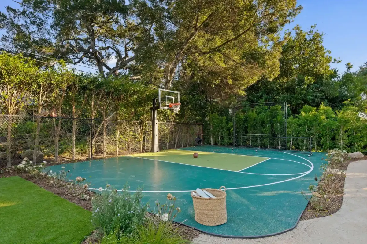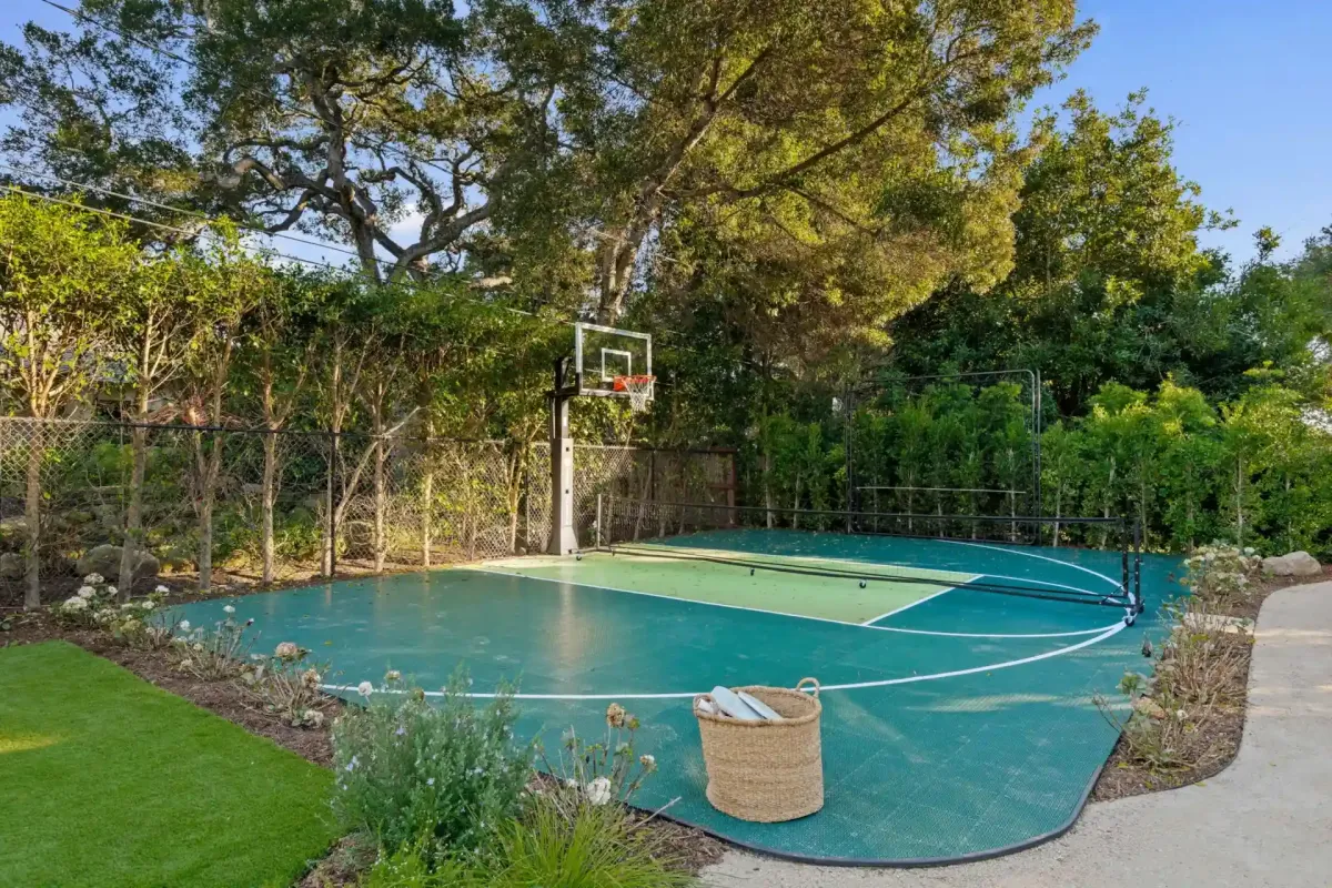 The gourmet kitchen, anchored by chef-inspired Wolf and Sub-Zero appliances, is fully equipped for your stay. Spend your afternoons on the private sports court for a game of basketball or pickleball or hone your stroke on the putting green. As evening falls, relax around the outdoor fireplace or unwind in the signature cedar hot tub under the stars.