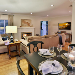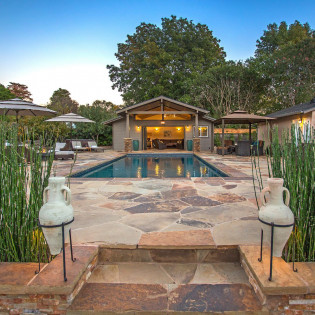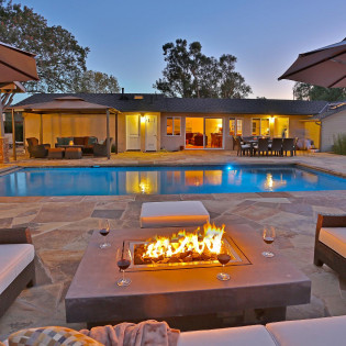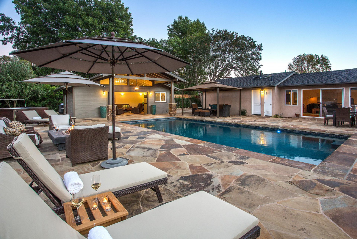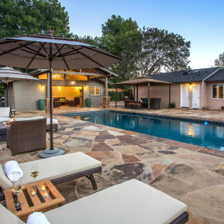 Inside, the Main House is separated into two wings, each containing two Bedrooms and a shared Bathroom. The Living Room includes a fireplace that can be enjoyed from the Dining Room, and the Kitchen is situated next to an outdoor Dining Area to accommodate large groups. The detached Guest House includes three Bedrooms, a Kitchen, two full Bathrooms, a Dining area, and Living Room. The Pool Cabana features retractable sliding doors, a large, leather sectional couch, a 70" flat-screen TV, and a wet bar with a refrigerator and sink.