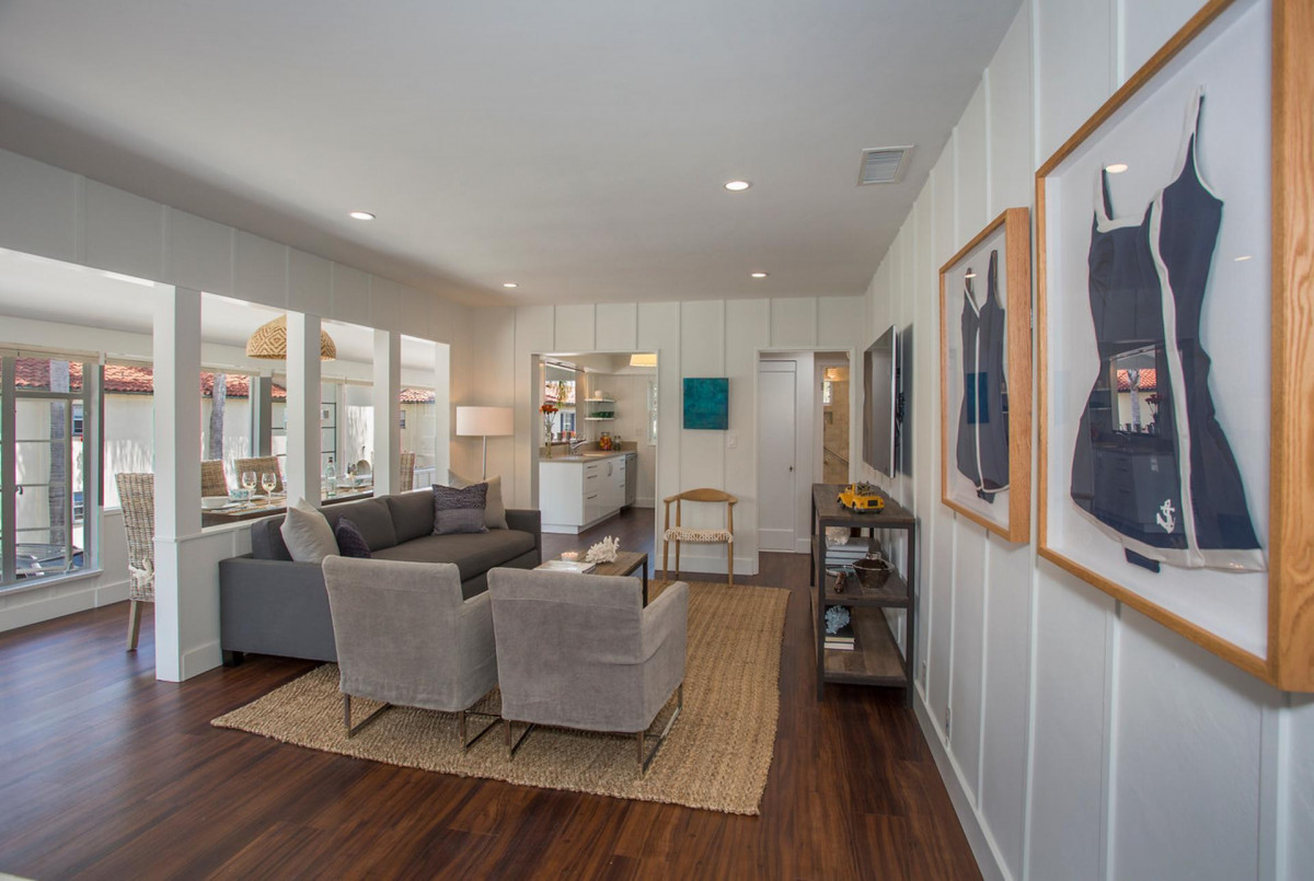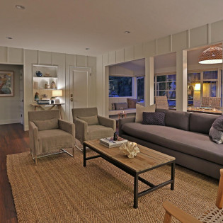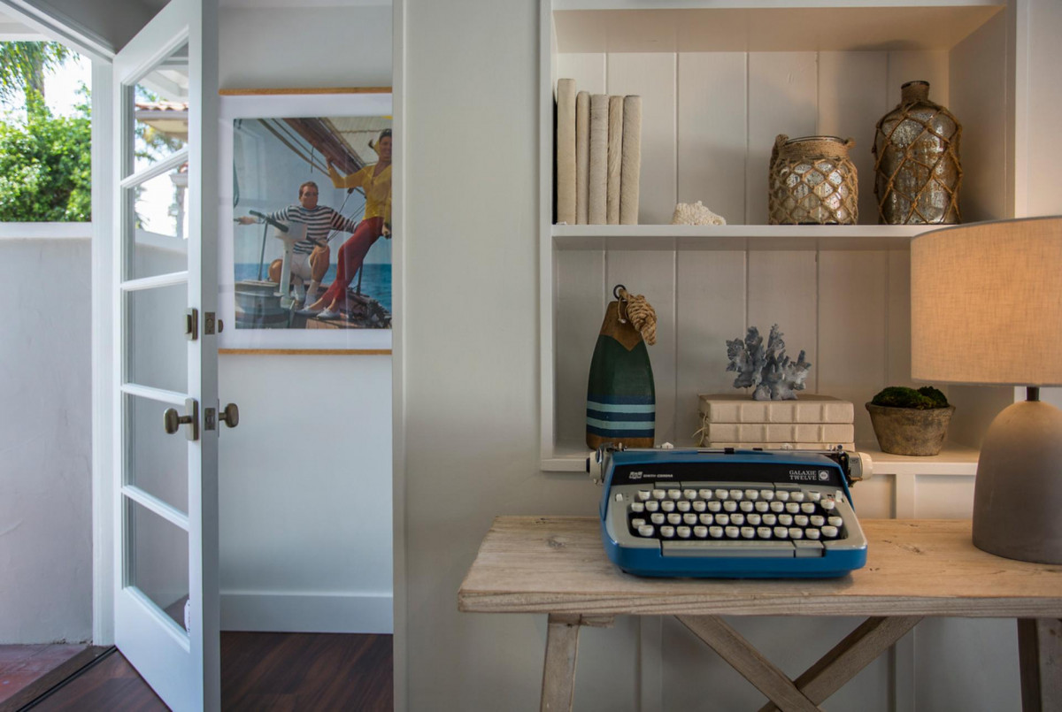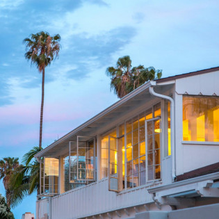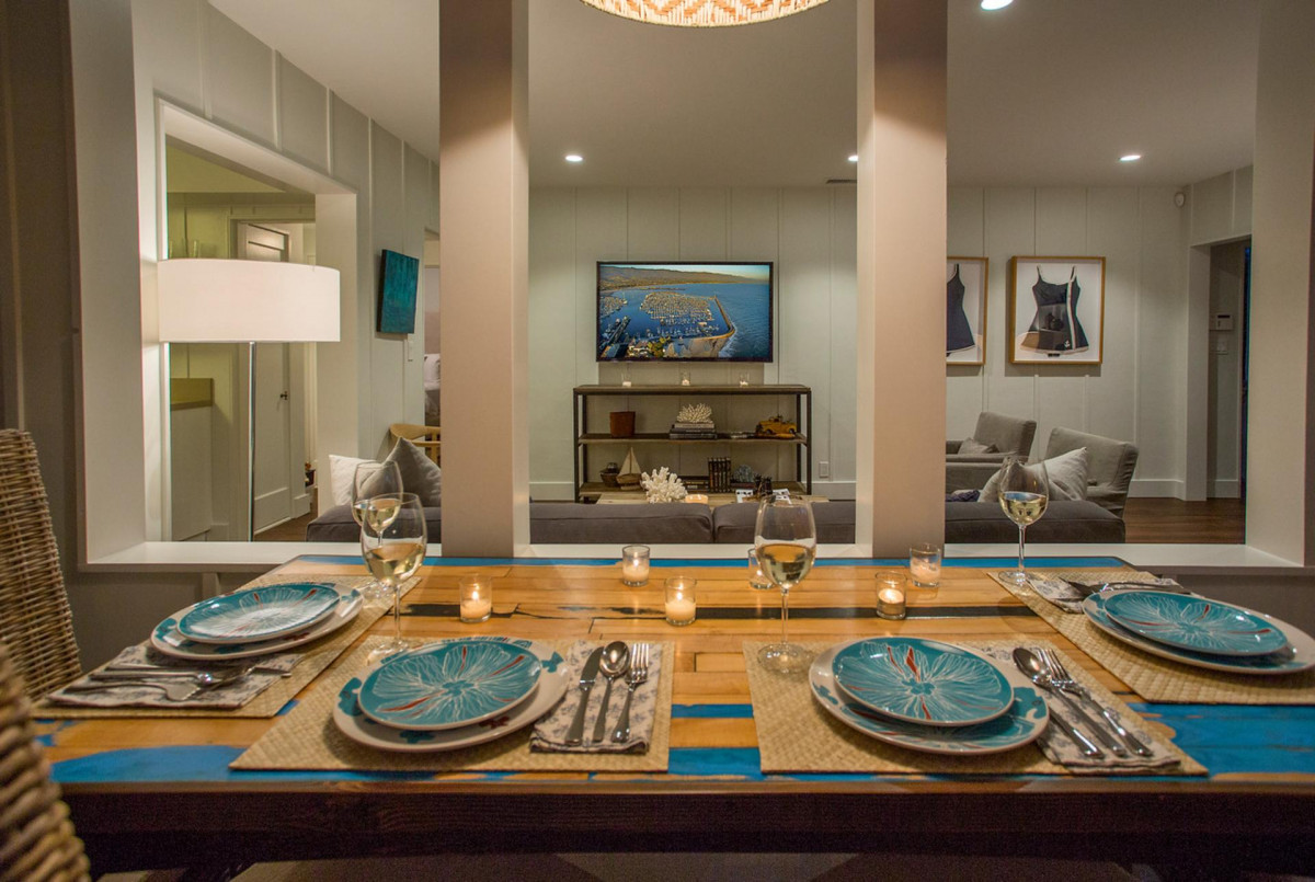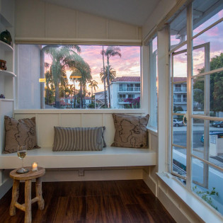 Walls of windows bring maximum light into this airy loft. The spacious Living Room is surrounded by an updated Kitchen and galley style Dining space. A custom breakfast bar and reading nook flank the dining table adding additional seating for larger groups. The Bedrooms are inspired by the coastal modern aesthetic connected by a spa-like Bathroom. A private outdoor deck offers additional lounge seating underneath the palm trees.